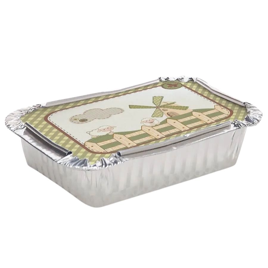 A Marmitinha M - Carneirinhos traz uma charmosa estampa com dois carneirinhos em destaque, inseridos em um cenário de fazendinha com fundo verde, cerca, moinho de vento e um detalhe xadrez no fundo que remete ao ambiente campestre. Ideal para festas temáticas de fazenda, chás de bebê e eventos infantis com tema rural.