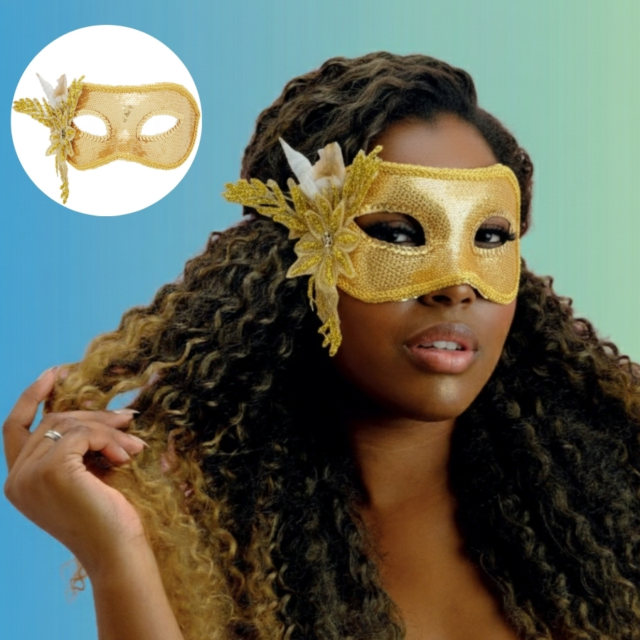 A Máscara de Carnaval combina glamour e conforto, com paetês dourados e elástico ajustável, ideal para completar fantasias.