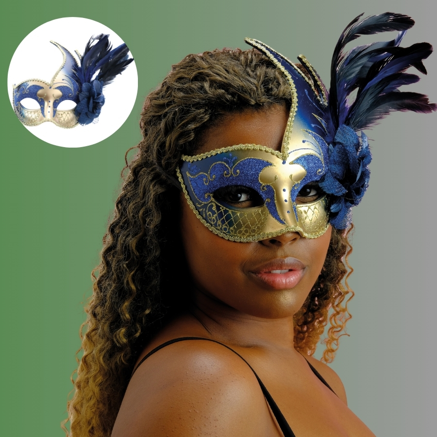 Essa máscara combina o brilho do dourado com a profundidade do azul, criando um contraste perfeito para destacar seu visual. Ideal para quem busca um item diferenciado e cheio de personalidade, ela é um complemento essencial para o look de Carnaval.