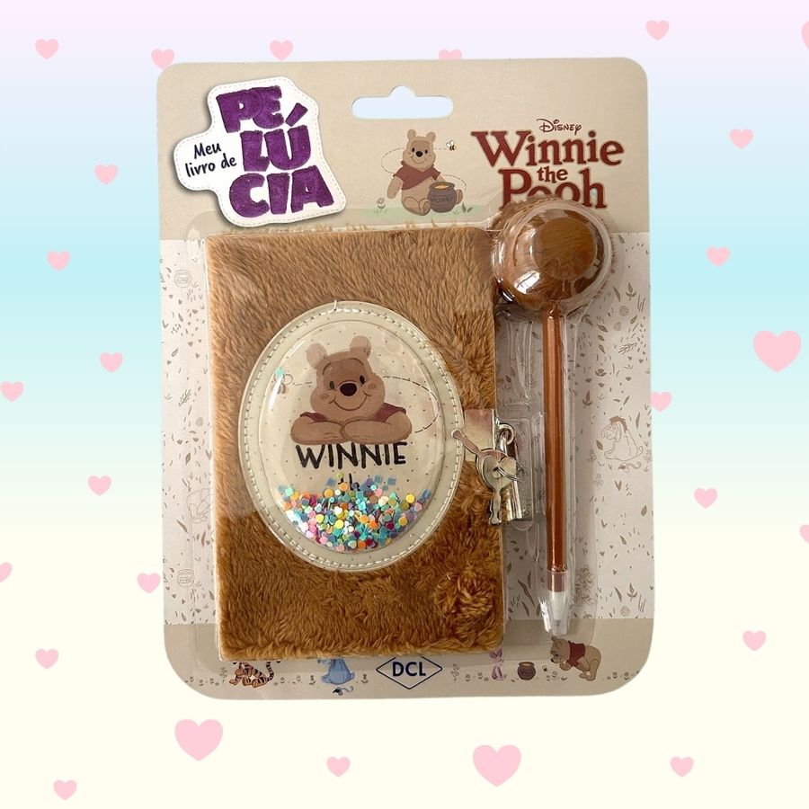 Livro peluciado com caneta decorada inspirada em Pooh Disney.