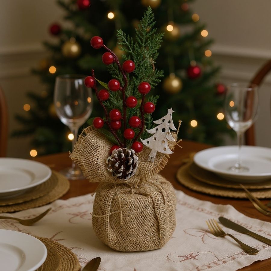 O Enfeite Decorativo de Natal - Mini Árvore de Berry - Vermelho e Verde - 27cm é uma peça encantadora para valorizar qualquer decoração natalina. Com 27cm de altura, é composta por um ramo de carvalho nevado, ramos com berries vermelhas e uma mini pinha nevada, tudo cuidadosamente envolto em um saco de juta. Ideal para mesas de centro, estantes, aparadores, prateleiras e projetos artesanais, traz charme, aconchego e o clima típico do Natal para o ambiente.