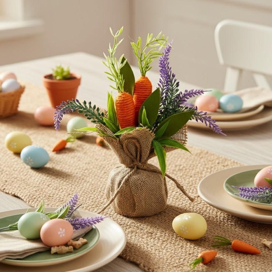 Mini árvore de Páscoa com enfeites de cenoura, ideal para decorar mesas e ambientes com alegria e estilo temático.