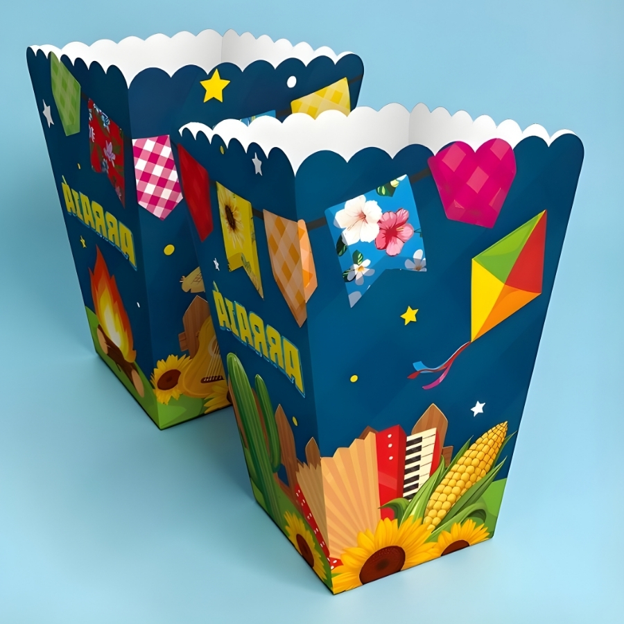 Com dimensões de 5,5x11,5x5,5cm, a mini caixa possui um tamanho prático para servir pequenas porções de pipoca ou doces durante o evento. Ideal para compor mesas temáticas, lembrancinhas ou servir petiscos em festas de São João, ela contribui para tornar a celebração mais organizada e festiva.