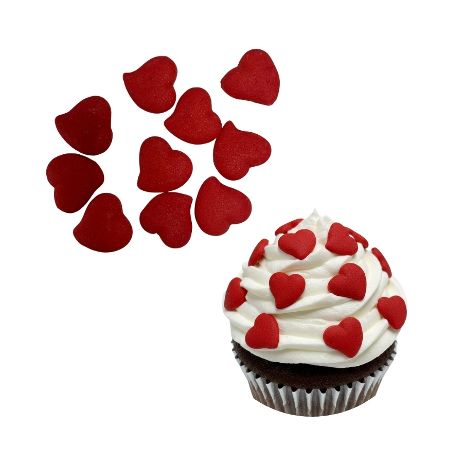 Confeito de açúcar em formato de coração vermelho pequeno, ideal para decorar doces com delicadeza e tema romântico.