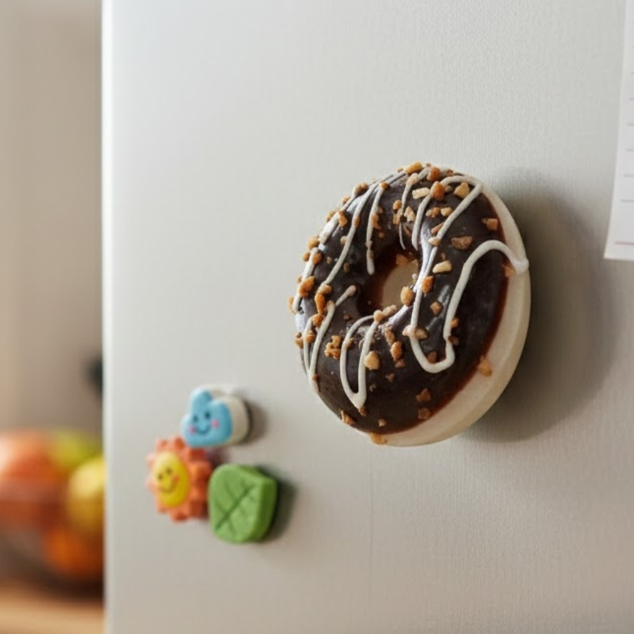 O produto é um enfeite decorativo com imã, em formato de mini donnut sortido, com tamanho de 7cm. É indicado para uso decorativo em superfícies metálicas e composições temáticas.