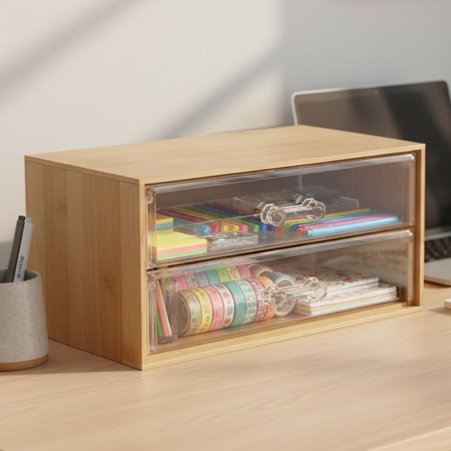 Este mini gaveteiro de mesa combina madeira e acrílico em um design funcional e contemporâneo, ideal para organizar pequenos objetos no dia a dia. Com duas gavetas, oferece praticidade sem ocupar muito espaço, sendo perfeito para manter itens sempre à mão de forma discreta e organizada.