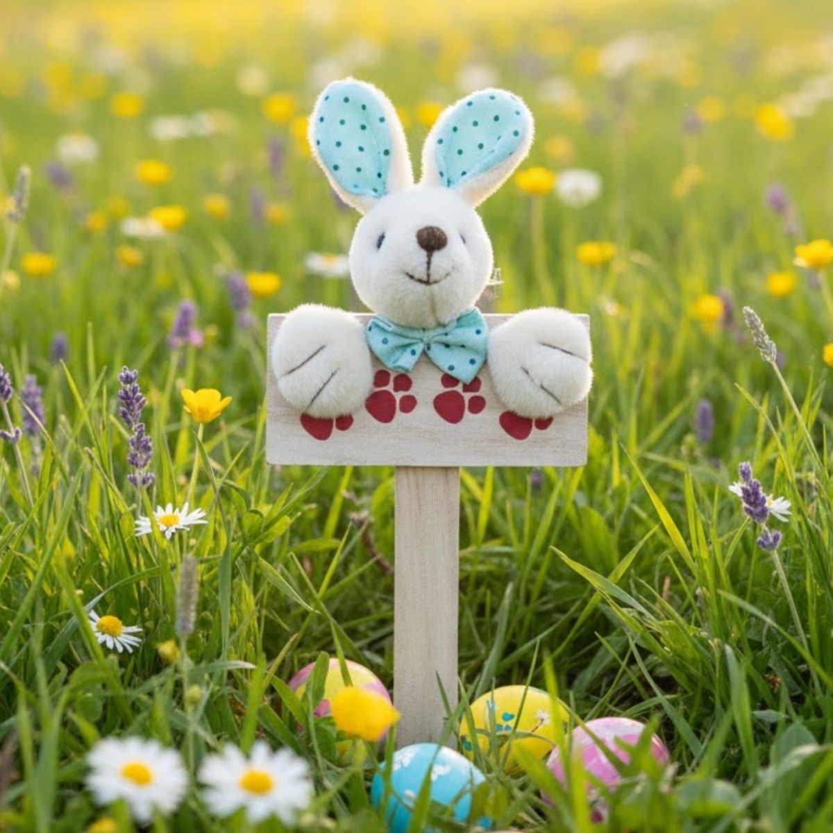 A Mini Placa Patinhas Coelho de Páscoa com Coelhinho e Laço Azul é perfeita para quem busca uma decoração pascal suave e charmosa. Produzida em madeira, apresenta diversas patinhas de coelho ilustradas, criando um fundo temático encantador. Em destaque, o coelhinho branco aparece apoiado na placa, usando um delicado laço azul, que adiciona elegância e equilíbrio ao visual.