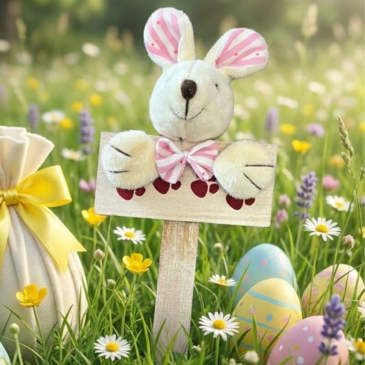 A Mini Placa Patinhas Coelho de Páscoa com Laço Rosa Listrado – 18,5cm é um enfeite encantador para deixar sua decoração pascal ainda mais fofa. A peça traz uma plaquinha decorada com patinhas de coelho estampadas, transmitindo aquele charme clássico da Páscoa. Sobre ela, um coelhinho bege se apoia de forma delicada, criando um visual acolhedor e super temático.