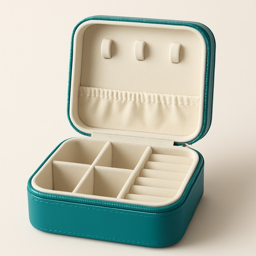 O Mini Porta Joias Portátil é ideal para manter seus acessórios organizados com praticidade e elegância. Produzido em couro sintético com interior em plástico resistente, possui fechamento em zíper e compartimentos internos que facilitam o transporte seguro de anéis, brincos, colares e outras pequenas joias.