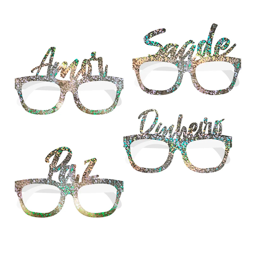 Adicione um toque de diversão e extravagância à sua festa de Ano Novo com estes óculos de papel holográfico. Em um conjunto de quatro unidades com palavras do que espera pro proximo ano, eles proporcionam não apenas uma experiência visual única, mas também transformam os olhares dos convidados em algo digno de uma celebração glamorosa.