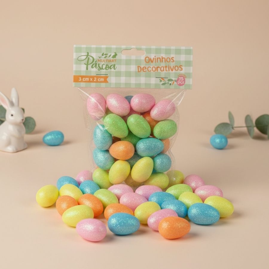 Ovinhos decorativos de Páscoa coloridos com glitter, 3cm, ideais para composições decorativas e cenários temáticos.