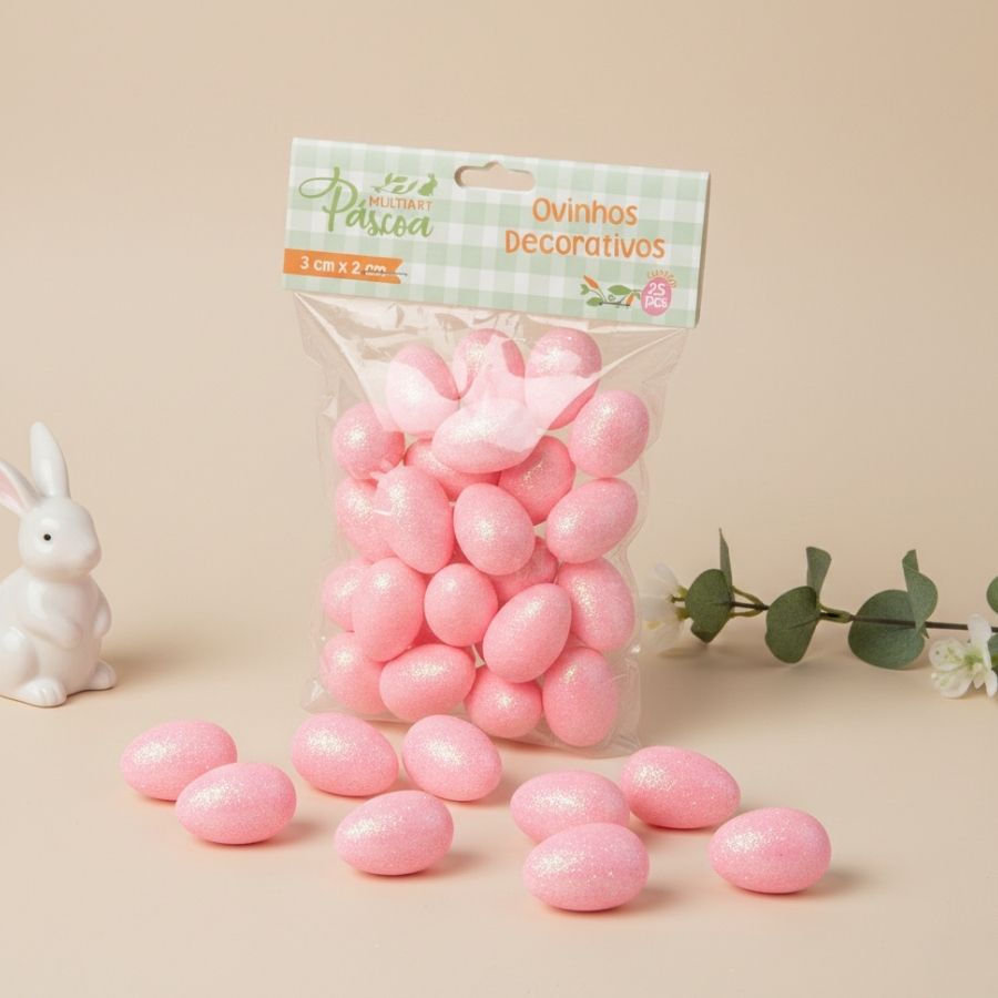 Ovinhos decorativos de Páscoa na cor rosa com glitter, 3cm, ideais para composições decorativas e cenários temáticos.