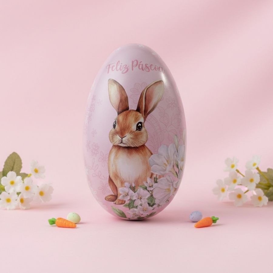 Ovo de metal de Páscoa rosa com estampa de coelho e flores, tamanho 11,3x6,8x7 cm, ideal para decoração, embalagens criativas e kits presenteáveis.