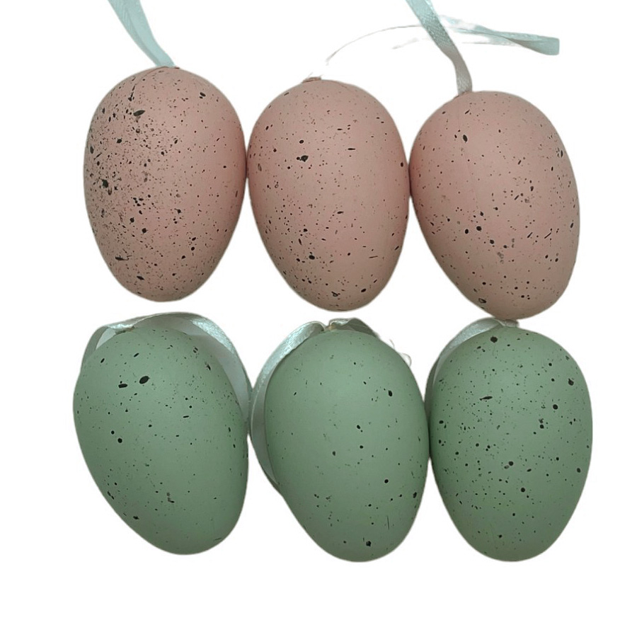 Ovos de Páscoa para pendurar, bege e verde pastel com respingos pretos