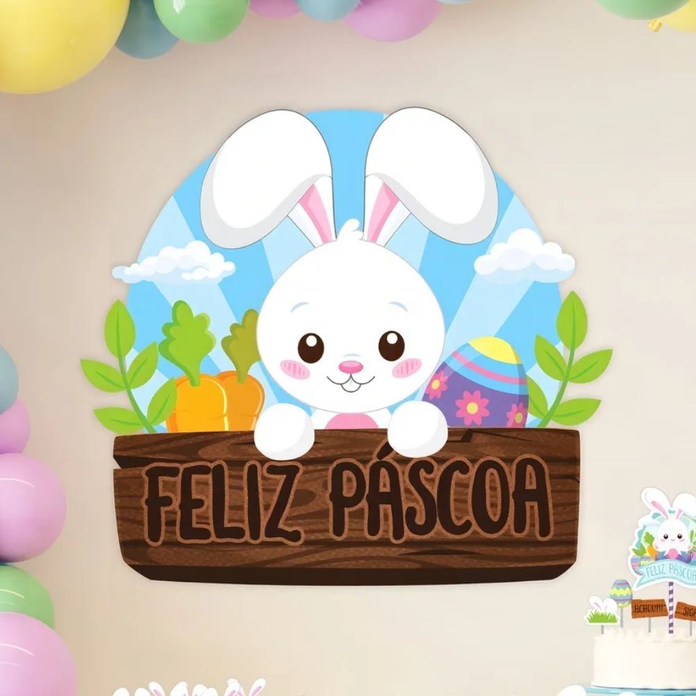 O painel decorativo de Páscoa traz um encantador coelhinho branco apoiado em uma placa de madeira com a mensagem “Feliz Páscoa”, acompanhado de ovinhos coloridos e um delicado fundo de céu azul. Com medidas aproximadas de 49x52cm, é uma peça de destaque que transforma qualquer ambiente em um cenário alegre e acolhedor.