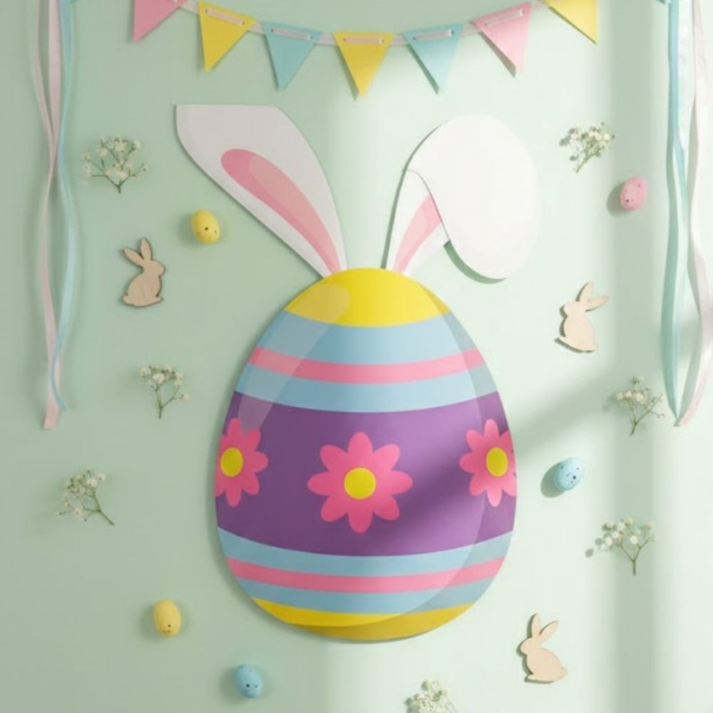 Ideal para festas infantis, vitrines, escolas ou ambientes residenciais, o painel de ovo com orelhas cria um ponto de destaque na composição. Suas cores vibrantes combinam facilmente com balões, caixas surpresa e outros elementos pascais, deixando o ambiente mais atrativo e fotogênico.
