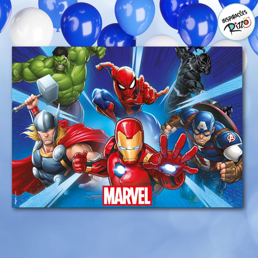 Painel decorativo com estampa inspirada nos Vingadores Marvel, ideal para criar um cenário de impacto em festas temáticas. Com tamanho de 64x45cm, é perfeito para compor o fundo da mesa principal ou ser usado em ambientes instagramáveis, trazendo os heróis mais famosos do universo Marvel para a comemoração.