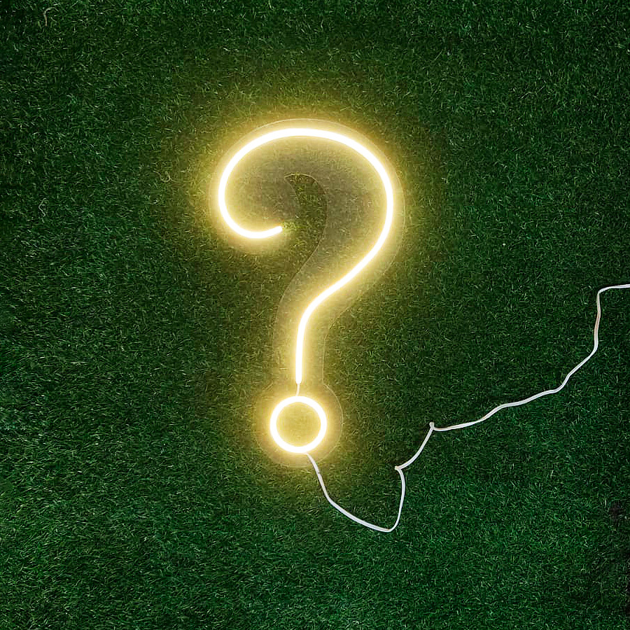 Um Painel Acrílico 3mm, tendo as dimensões de 47cm de altura por 26cm de altura com um Ponto de Interrogação com mangueira led neon na cor amarela acompanhando fonte 12v bivolt