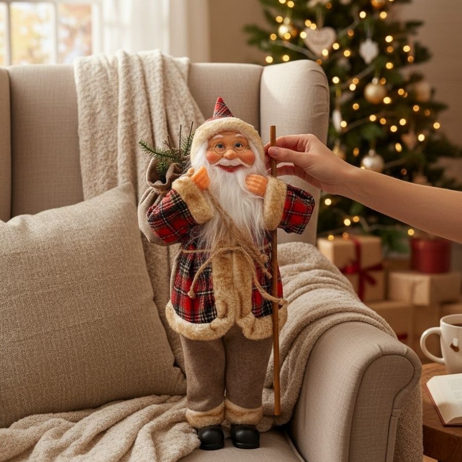 O Papai Noel Decorativo em Pé com Saco e Mastro - Vermelho Xadrez - 45cm é uma peça encantadora que combina tradição, elegância e o verdadeiro espírito natalino. Vestido com roupas em vermelho xadrez e segurando um saco de plantas e um mastro decorativo, ele adiciona um toque acolhedor e sofisticado à sua decoração de Natal.