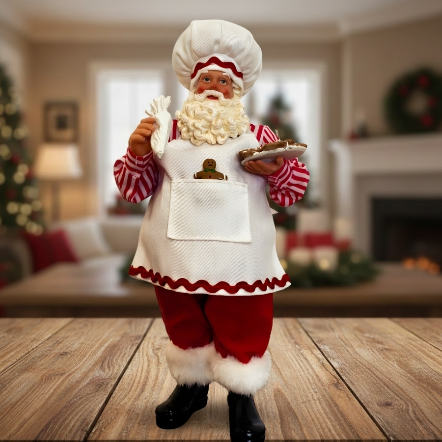 Este é um boneco decorativo de Natal representando o Papai Noel caracterizado como um Confeiteiro (Chef). O enfeite está na posição em pé e é predominantemente nas cores Vermelho e Branco, mantendo o espírito clássico natalino. Com 28cm de altura, é uma peça de porte médio ideal para enriquecer a decoração de mesa ou bancadas. É um item de decoração temática perfeito para cozinhas, vitrines de docerias ou para presentear quem trabalha com gastronomia e culinária na época festiva.