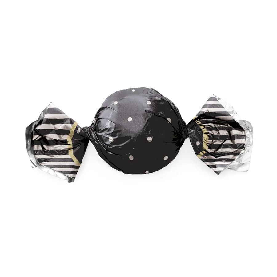 Papel laminado para trufas e bombons, com a estampa preta e bolinhas brancas.