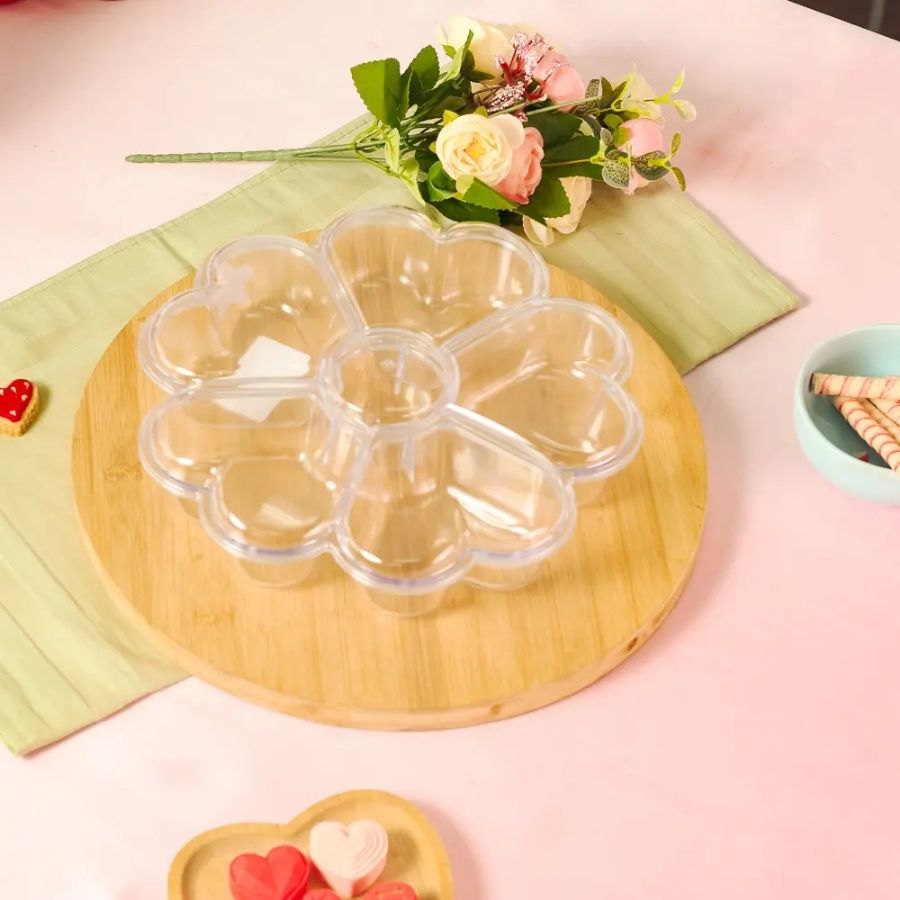 Petisqueira em acrílico, com o formato de flor de corações e transparente