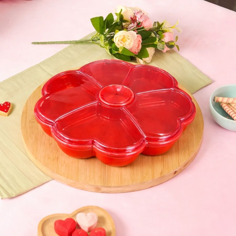Petisqueira em acrílico, com o formato de flor de corações e vermelho translucido