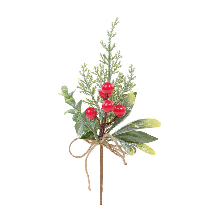 Pick decorativo de galho curto com filhas e sementes vermelhas, e um laço em juta