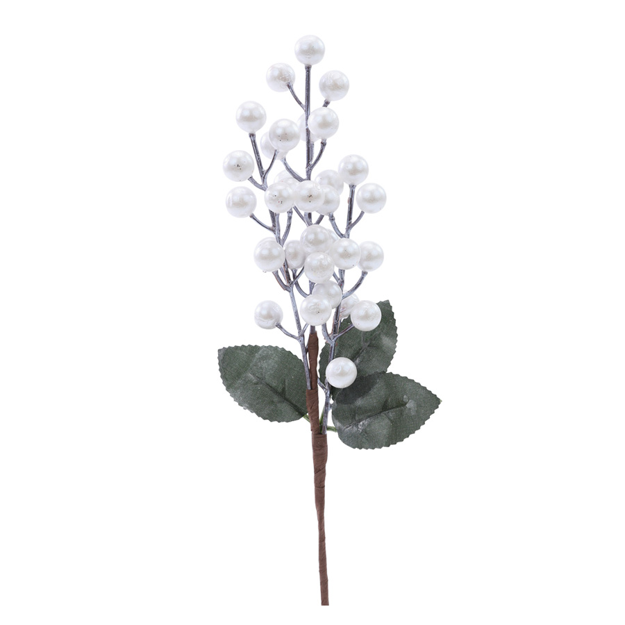 Pick decorativo de galho com folhas e frutinhas brancas