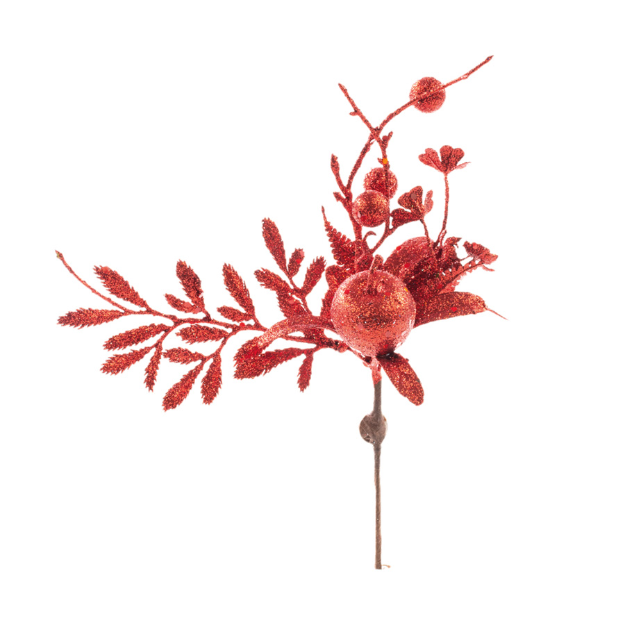 Galho decorativo de folhas, flores, e frutinhas totalmente corbertos por glitter vermelho