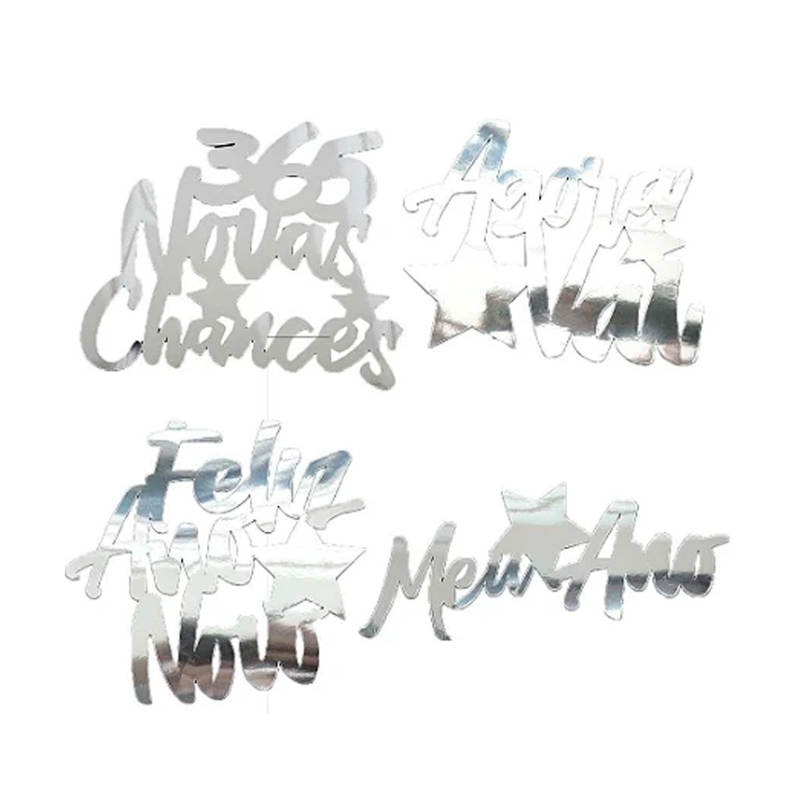 4 Frases pra comemorar o ano novo em papeis prateados metalizados coladas sobre canudos de plastico, As frases sendo "Feliz Ano Novo","Agora vai(acompanhado com uma estrela)", "365 novas chances", "Meu Ano(acompanhado com uma estrela)"