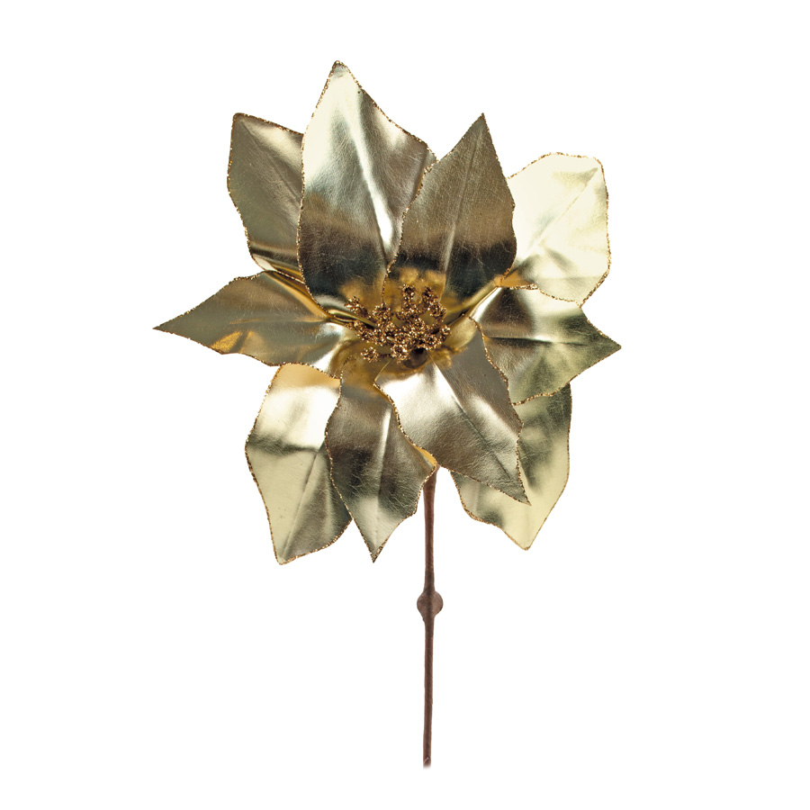 Poinsétia decorativa com pétalas cromadas em cor champagne, com bordas cobertas por glitter da mesma cor , e sementes com o mesmo glitter no meio da flor
