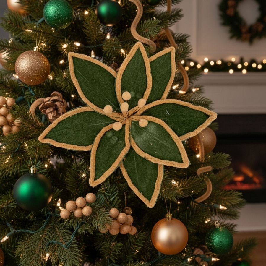 Poinsétia decorativa Cromus em veludo verde e bege, 39x28cm, resistente e elegante, ideal para árvores, guirlandas e arranjos natalinos sofisticados.