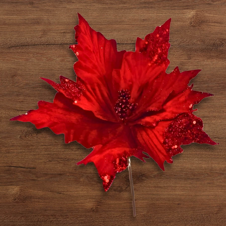 A Poinsétia Decorativa Veludo Vermelho com Glitter mede 25,5x25x9cm, confeccionada em material durável com acabamento em veludo e glitter de alta qualidade. Indicada para decoração de Natal, garante destaque visual e praticidade em qualquer ambiente.