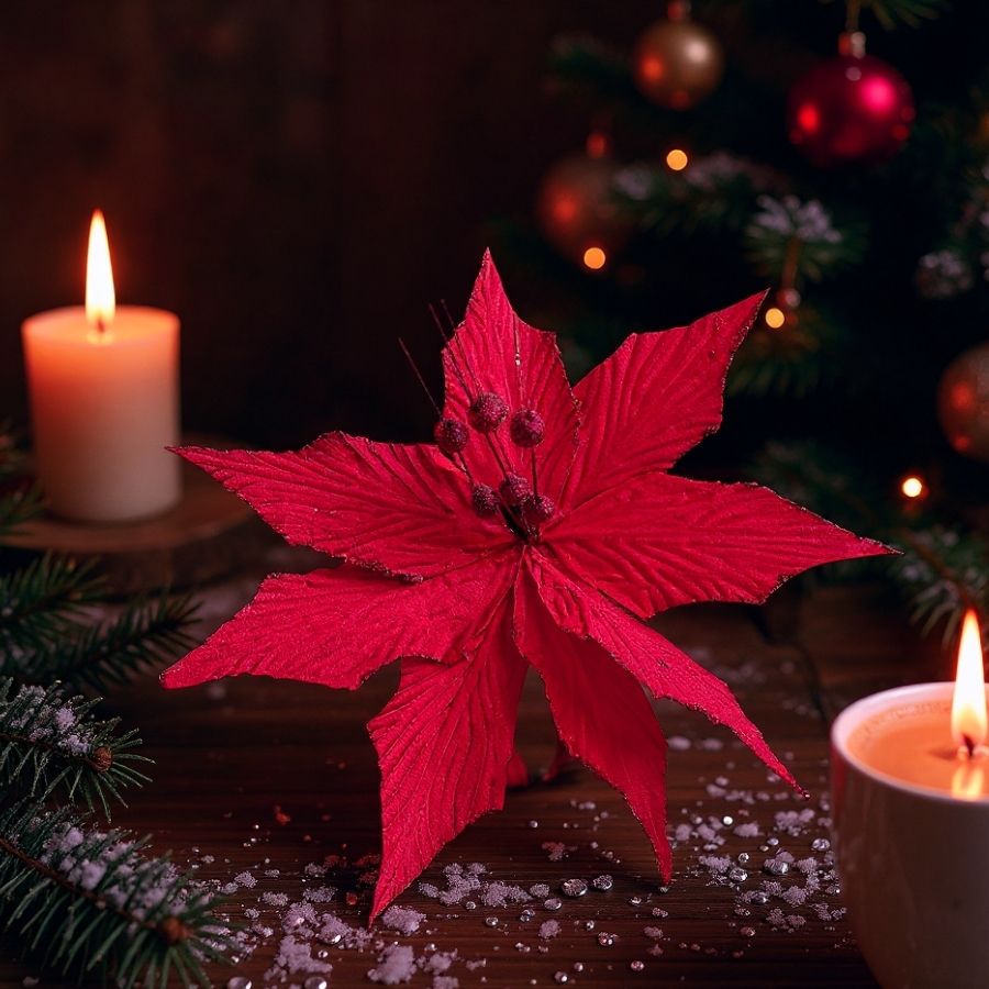 A Poinsétia Decorativa Vermelha com Glitter é elegante, vibrante e tradicional, ideal para realçar a beleza das decorações natalinas com brilho e estilo.