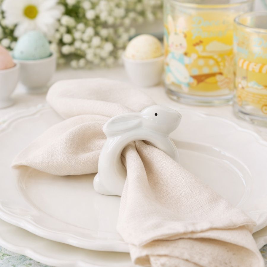 Porta guardanapo decorativo de Páscoa em porcelana no formato de coelho branco, ideal para mesas postas e composições temáticas. Mede aproximadamente 7x8cm e adiciona elegância e delicadeza à decoração pascal.