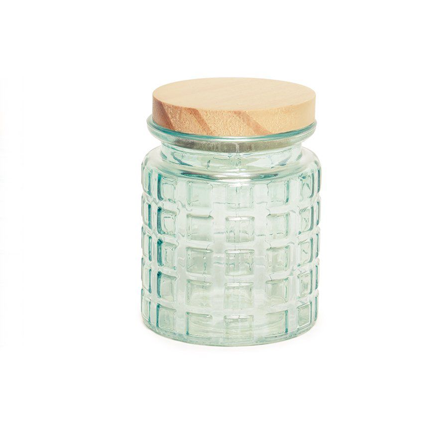 Pote de vidro quadriculado com tampa de madeira Cromus. Com uma textura divertida ele pode ser utilizado para diversos casos!