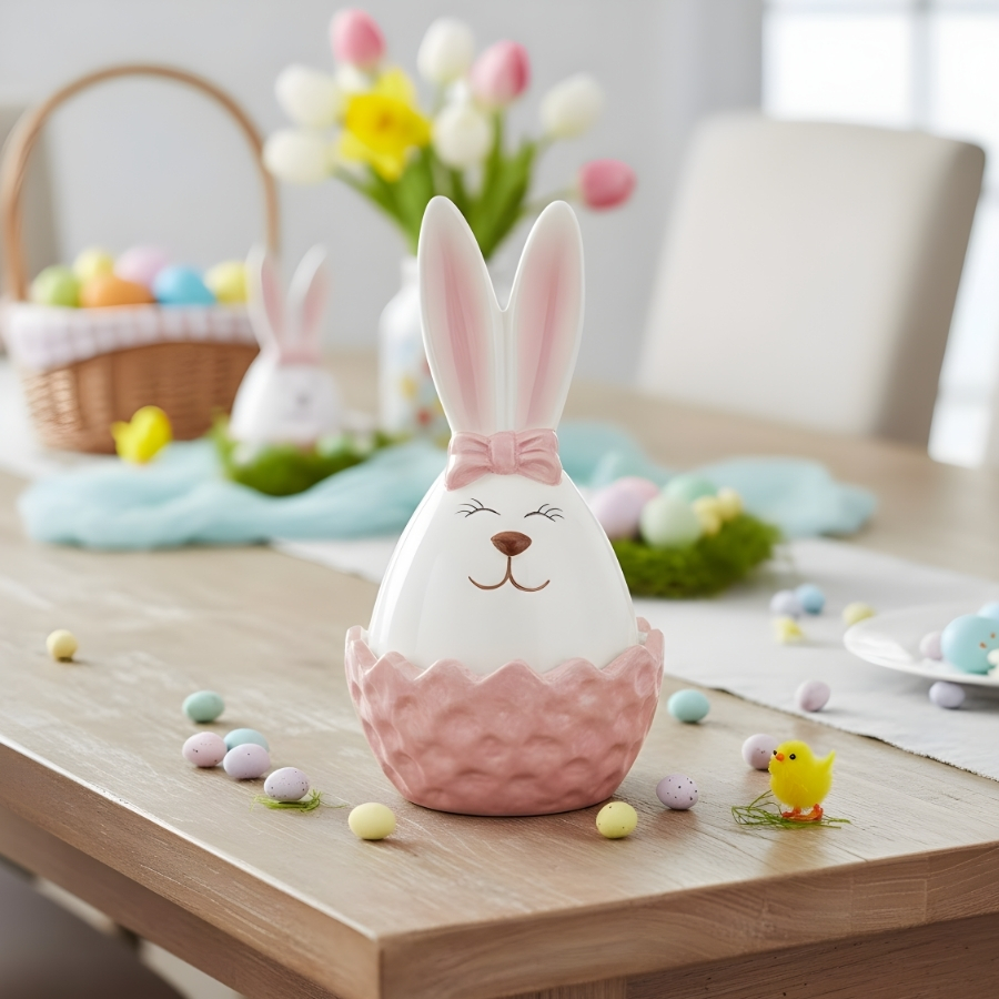 O potinho de cerâmica de Páscoa com tampa possui dimensões aproximadas de 13x8x8cm e apresenta estampa de coelha nas cores rosa e branca. É indicado para uso como recipiente decorativo, lembrancinha de Páscoa, composição de kits presenteáveis e decoração temática em diferentes ambientes.
