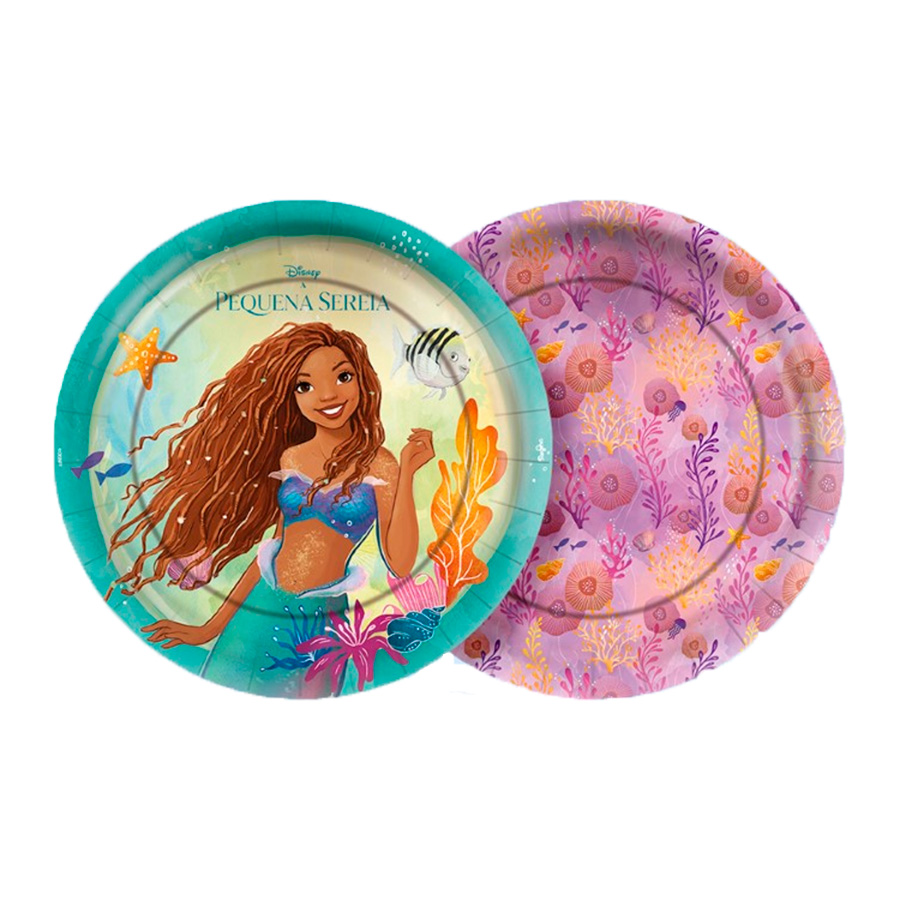 Prato de Papel Redondo - Pequena Sereia: Pratos descartáveis temáticos da Pequena Sereia, ideais para servir alimentos durante a festa. Tamanho: 18 cm de diâmetro. Feitos de papel cartão.