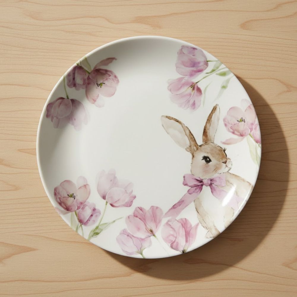 O Prato de Melamina é uma peça delicada e temática, perfeita para compor mesas decoradas com charme e suavidade. Decorado com coelho e flores, traz um visual alegre e harmonioso, ideal para a Páscoa ou para quem gosta de itens decorativos com temática delicada.