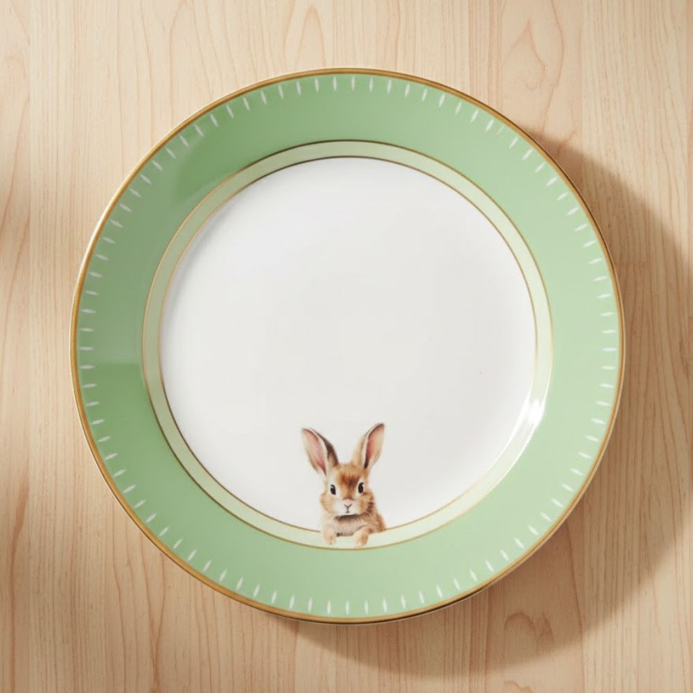 O Prato de Melamina é uma peça temática e elegante, perfeita para compor mesas especiais de Páscoa. No centro, apresenta um coelho fofo, enquanto as bordas verdes com detalhe dourado trazem sofisticação e charme à composição.