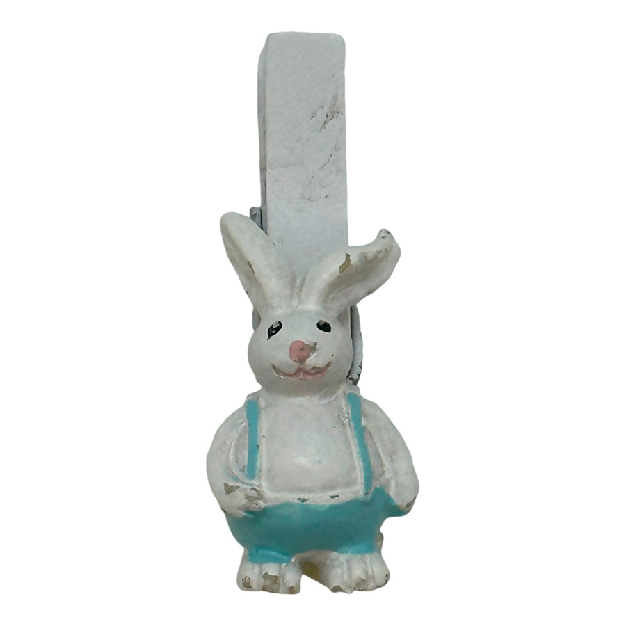 Prendedor com figura de coelho branco usando uma jardineira azul claro