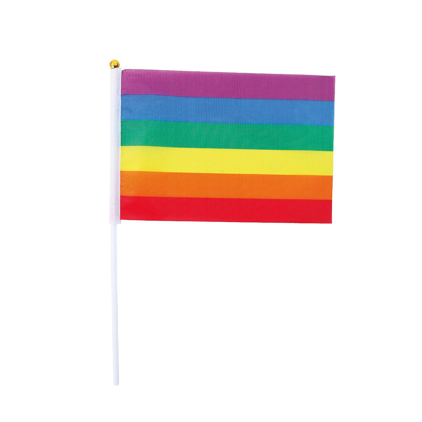 Um pacote contendo uma bandeira de 14cm por 21cm com as cores do arco-irís e um mastro branco com a ponta dourada tendo 30cm.