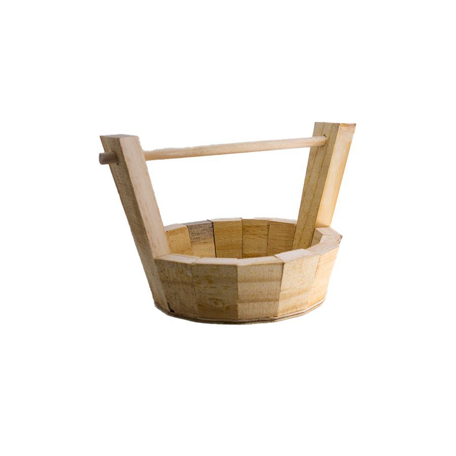 Um caixote de madeira em formato de poço, de madeira crua, artesanal.