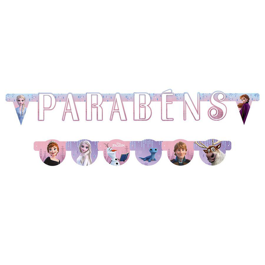 Faixa: Contém duas peças, sendo uma delas com nome parabéns, montada mede aproximadamente 14,5cm de altura e 120cm de largura. Já a segunda faixa vem personalizada com os personagens da Frozen 2, a mesma montada mede aproximadamente 10cm de altura e 77cm de largura. Acompanha um cordão de algodão