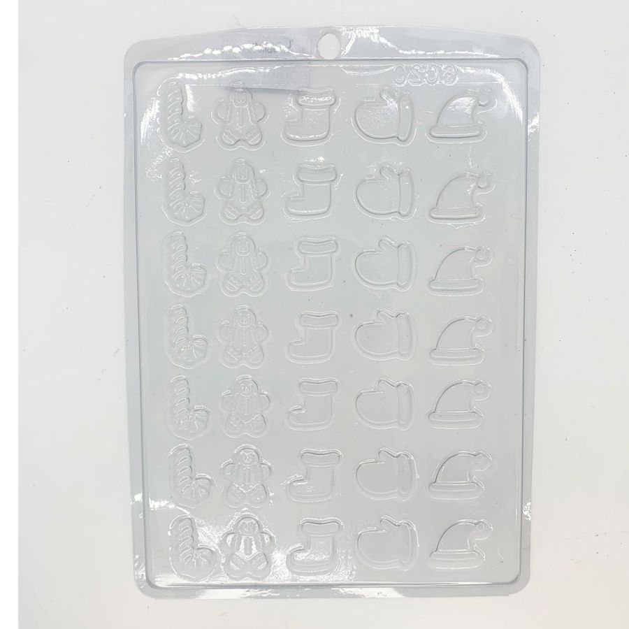 A forma de acetato possuí 5 moldes diferentes de 2,5cm cada um. Contém os formatos de bengala doce, gorro de natal, luva de natal, biscoito de natal e meia de natal.