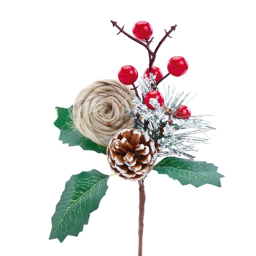 O galho artificial, possuí frutinhas vermelhas, u,a mini pinha marrom, folhas verdes, um cabo marrom e dois enfeites bege.