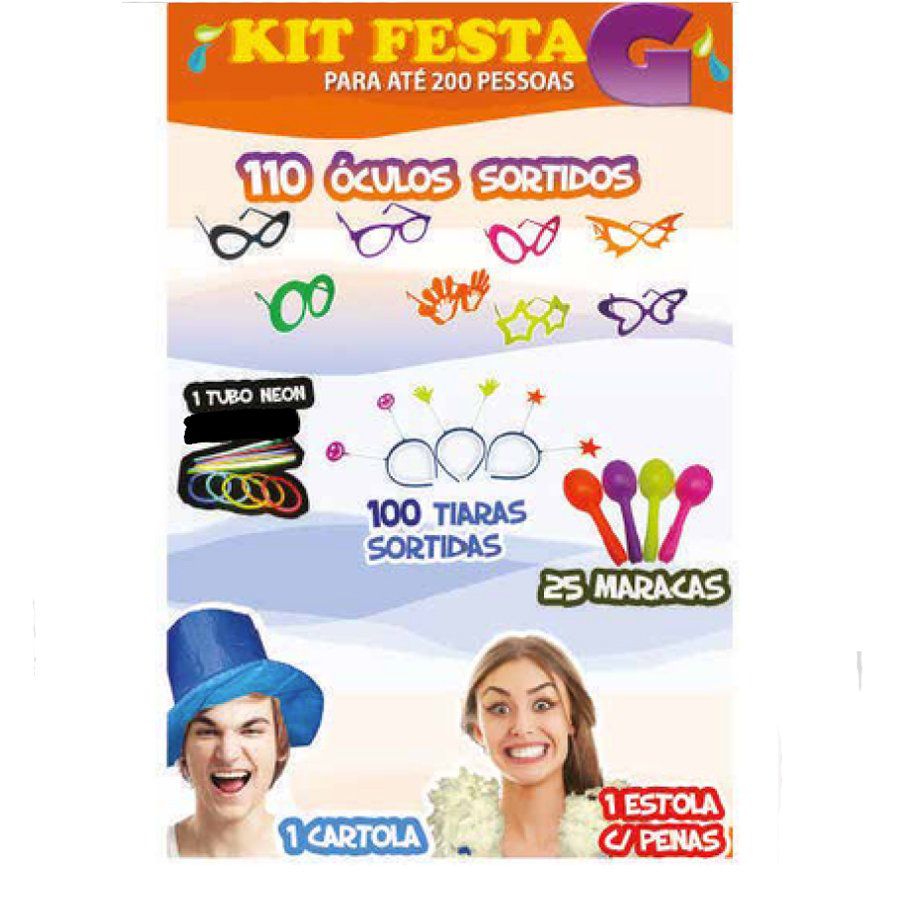110 Óculos Sem Lente - 100 Tiaras Com Simbolos - 1 Cartola Em Tecido - 1 Estola Com Penas - 25 Maracas Plásticas