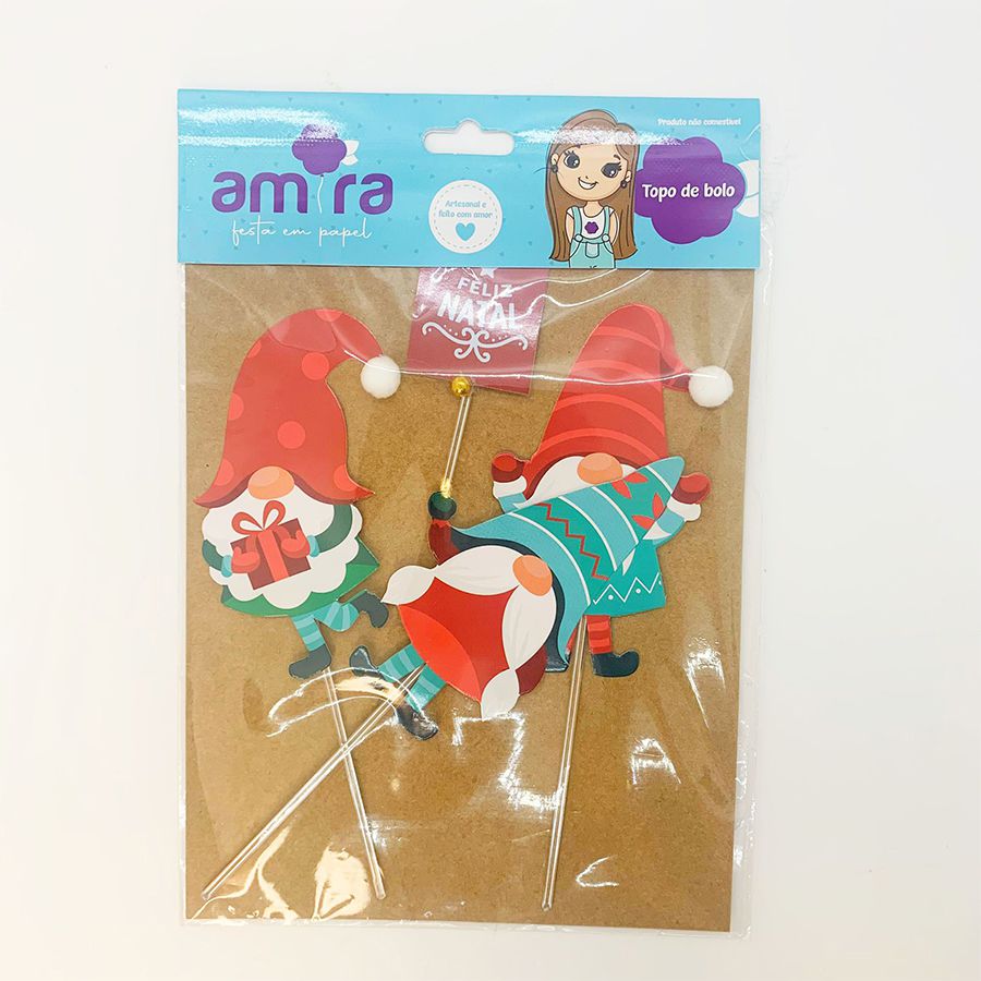 O kit de topo de bolo com três duendes possuí duendes ou também conhecidos como Kringles de Natal, com gorros vermelhos e verdes, barba branca,sapatos verdes escuros e um deles segura uma plaquinha escrito Feliz Natal.
