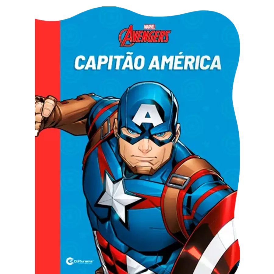 Livro ilustrado inspirado no Capitão América Disney, com capa fosca e verniz localizado. Formato recortado divertido, ideal para presentear e usar como lembrancinha de festa.